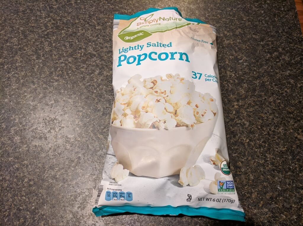 Aldi’s popcorn is an organic simple bagged popcorn. It has a good crunch and even dusting of salt.